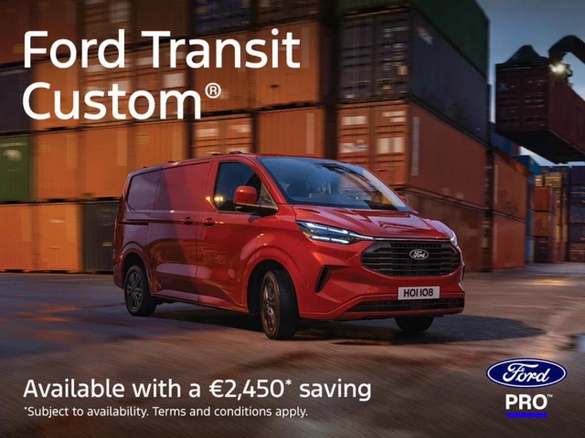 ©2025 Ford Motor Company. Ford Transit Custom is a trademark of Ford and its affiliates. *There is a saving of €2,450 on Transit Custom models when ordered between 20th October and 31st December 2025 and registered by 31st March 2026. Imagery and information may not reflect local market specification. †According to SMMT data. *Ford Pro™ E-Telematics is complimentary for 12 months from the warranty start date on the E-Transit Custom after which subscription charges apply. Eligible Fleet/business customers only. Ford Pro™ Fleet Marketplace T&Cs apply. Screen designs may vary.